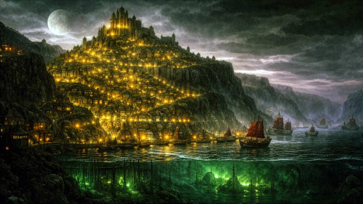 A vertical city carved into black volcanic cliffs — nine districts, noble houses, and a cathedral hiding dark secrets.